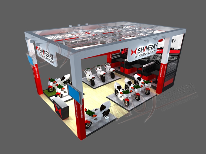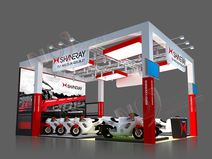 契合鑫源摩托的品牌形象和產(chǎn)品特性,采用矩形結(jié)構(gòu),再搭配燈具燈光的效果,襯托出展位簡約、時尚的氛圍,突出一種現(xiàn)代、簡約的時尚品味。