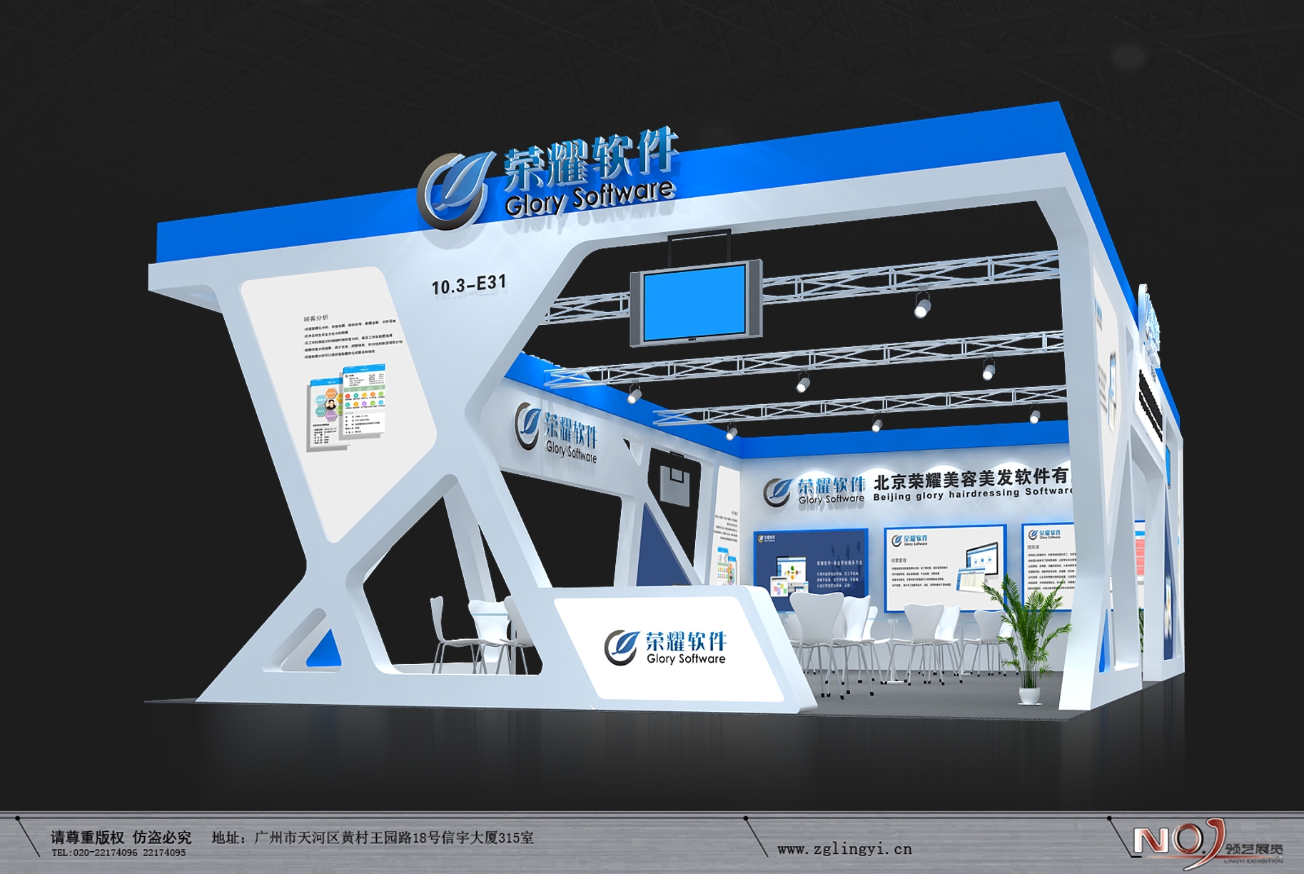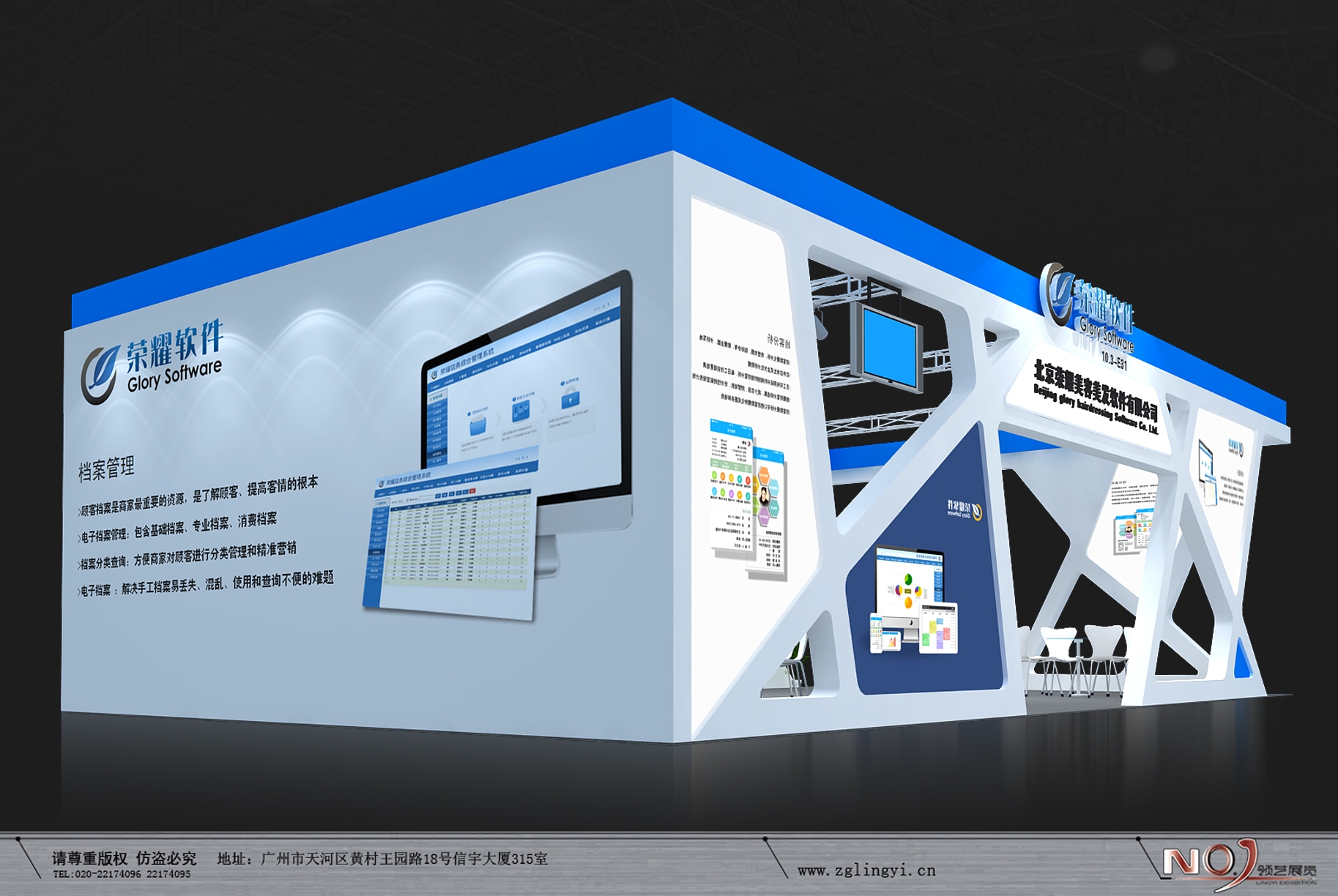 契合榮耀軟件的品牌形象和產(chǎn)品特性,采用線條,再搭配燈具燈光的效果,襯托出展位簡約、舒適的氛圍,突出一種現(xiàn)代、高端的時尚品味。