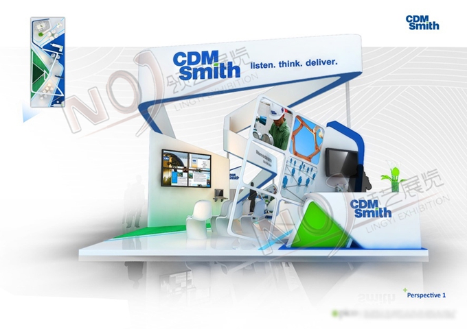 契合CDM Smith的品牌形象和產(chǎn)品特性,采用立體結(jié)構(gòu),再搭配燈具燈光的效果,襯托出展位高端、時尚的氛圍,突出一種現(xiàn)代、大氣的時尚品味。
