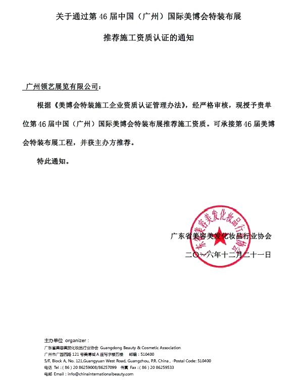 此次領(lǐng)藝展覽通過美博會嚴(yán)格的資質(zhì)審核,再一次獲得美博會特裝布展的推薦施工資質(zhì)。我們將會繼續(xù)和發(fā)揚一貫的專業(yè)精神與良好的服務(wù)立場,為參展客戶提供最優(yōu)質(zhì)的美博會展臺設(shè)計搭建服務(wù),輔以完善的展位后續(xù)服務(wù)。追求專業(yè)化、實現(xiàn)品牌戰(zhàn)略聯(lián)盟化、邁向國際化,我們堅守承諾、始終如一。