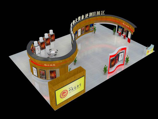 陜西展位外形設(shè)計(jì)為一幅畫卷,打開畫卷正面是LED大屏,循環(huán)播放陜西近年來創(chuàng)作的舞臺(tái)優(yōu)秀劇目和籌辦第十一屆中國藝術(shù)節(jié)期間陜西舉辦的各類大活動(dòng)。畫卷的背面是四排立柱,代表了陜西以周、秦、漢、唐為代表的悠久歷史。立柱上頂四方代表關(guān)中平原,兩側(cè)曲面代表陜南、陜北。展位后面是黃河波浪的造型,后浪推前浪代表著三秦兒女自強(qiáng)不息、奮發(fā)向上、勇于拼搏的精神。