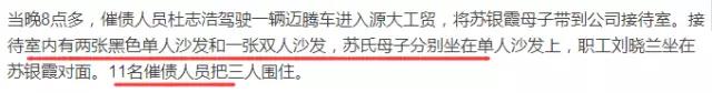 事情起因是這樣的,蘇銀霞開辦的公司資金周轉遇困,不得已向吳學占借款共計135萬元,約定月利息10%(遠超法律規(guī)定的36%年利息上限)。在蘇銀霞共還款184萬元,并將一套140平米價值70萬的房子抵債后,“還剩最后17萬欠款,公司實在還不起了”。結果,就遭到涉黑勢力的恐怖逼債。