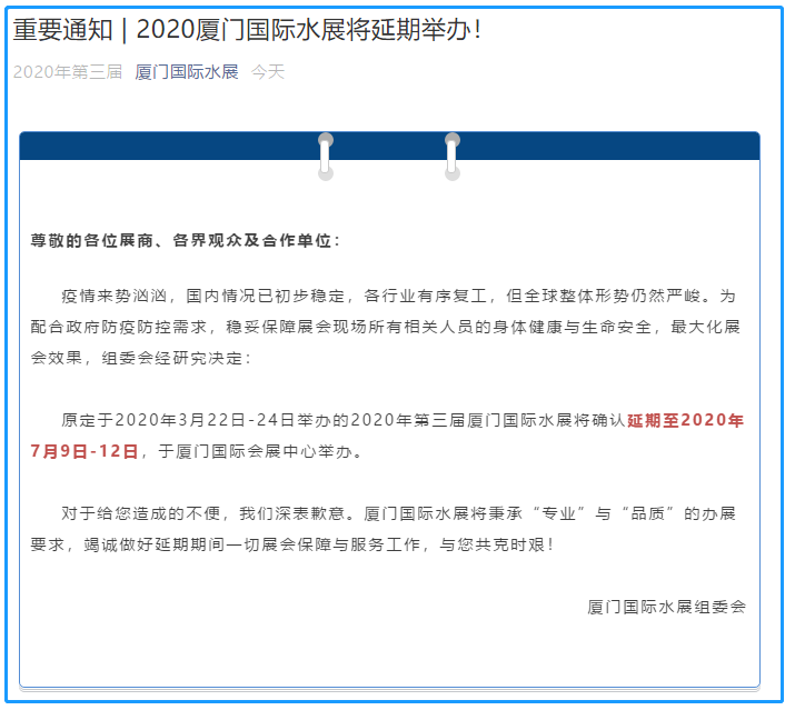 根據(jù)廈門水展設(shè)計搭建公司領(lǐng)藝展覽了解到,原定于2020年3月22日-24日舉辦的2020年第三屆廈門國際水展將確認延期至2020年7月9日-12日,于廈門國際會展中心舉辦。如需廈門水展設(shè)計請聯(lián)系領(lǐng)藝展覽,希望我們能在廈門水展搭建上為您添磚加瓦,祝各位朋友收獲多多,滿載而歸!