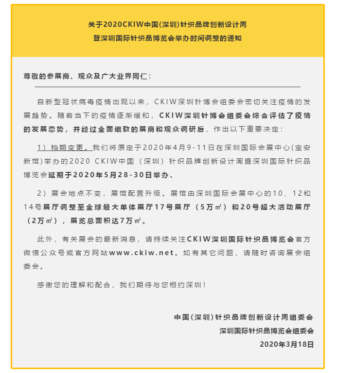 根據(jù)針博會(huì)設(shè)計(jì)搭建公司領(lǐng)藝展覽了解到,原定于2020年4月9-11日在深圳國際會(huì)展中心(寶安新館)舉辦的2020 CKIW中國(深圳)針織品牌創(chuàng)新設(shè)計(jì)周暨深圳國際針織品博覽會(huì)延期于2020年5月28-30日舉辦。如需針博會(huì)展會(huì)設(shè)計(jì)請(qǐng)聯(lián)系領(lǐng)藝展覽,希望我們能在針博會(huì)搭建上為您添磚加瓦,祝各位朋友收獲多多,滿載而歸!