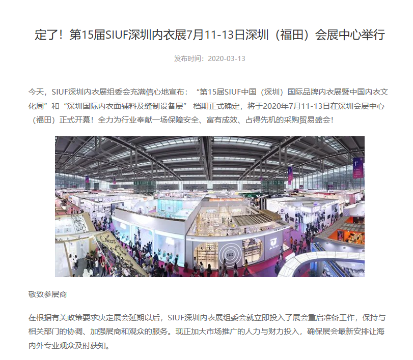 根據(jù)深圳內(nèi)衣展設計搭建公司領藝展覽了解到,SIUF深圳內(nèi)衣展組委會充滿信心地宣布:“第15屆SIUF中國(深圳)國際品牌內(nèi)衣展暨中國內(nèi)衣文化周”和“深圳國際內(nèi)衣面輔料及縫制設備展” 檔期正式確定,將于2020年7月11-13日在深圳會展中心(福田)正式開幕!全力為行業(yè)奉獻一場保障安全、富有成效、占得先機的采購貿(mào)易盛會!如需深圳內(nèi)衣展設計請聯(lián)系領藝展覽,希望我們能在深圳內(nèi)衣展搭建上為您添磚加瓦,祝各位朋友收獲多多,滿載而歸!