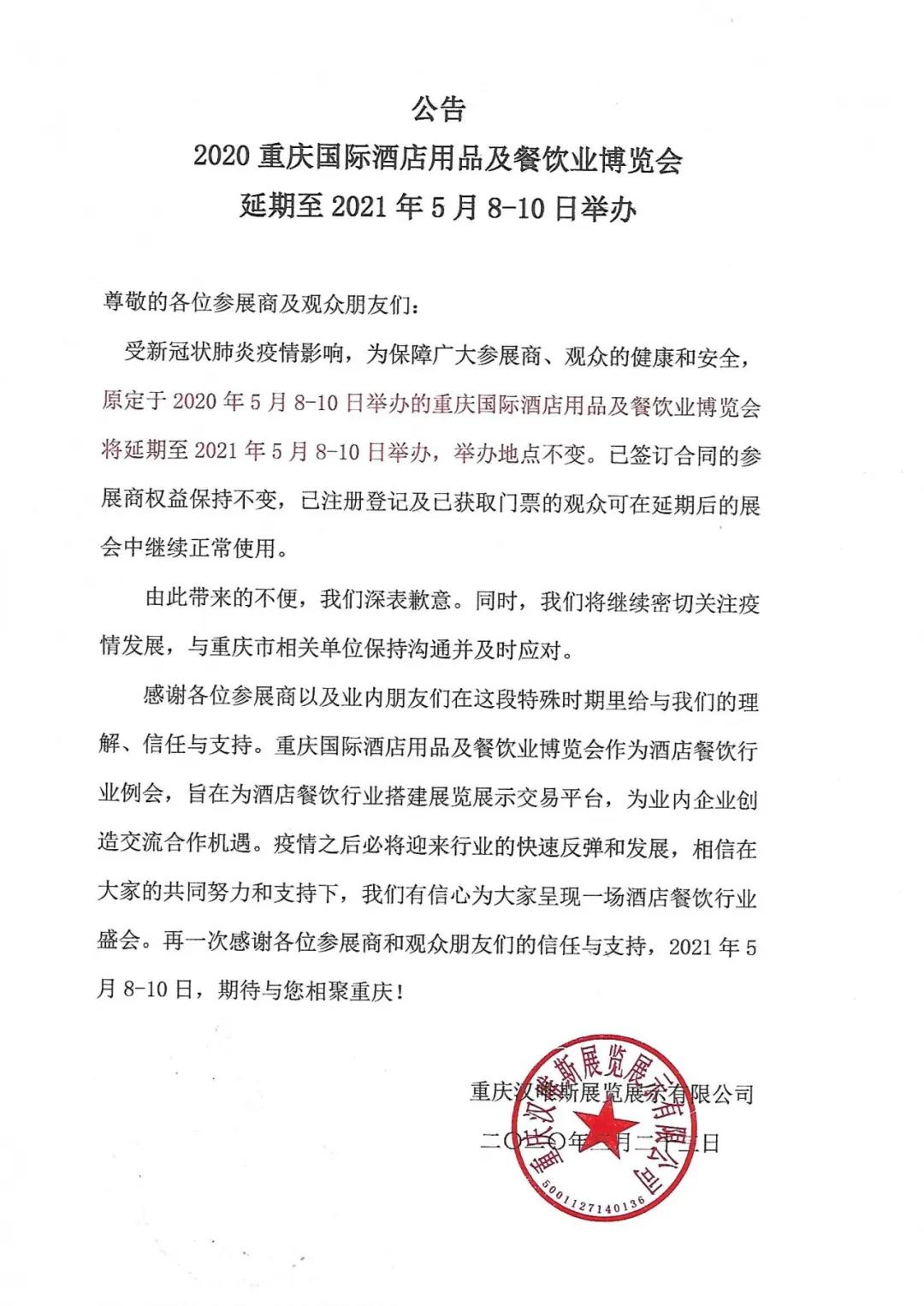 根據(jù)酒店用品展設(shè)計(jì)搭建公司領(lǐng)藝展覽了解到,受新冠狀肺炎疫情影響,為保障廣大參展商、觀眾的健康和安全,原定于2020年5月8-10日舉辦的重慶國際酒店用品及餐飲業(yè)博覽會(huì)將延期至2021年5月8-10日舉辦,舉辦地點(diǎn)不變。如需酒店用品展設(shè)計(jì)請(qǐng)聯(lián)系領(lǐng)藝展覽,希望我們能在酒店用品展搭建上為您添磚加瓦,祝各位朋友收獲多多,滿載而歸!