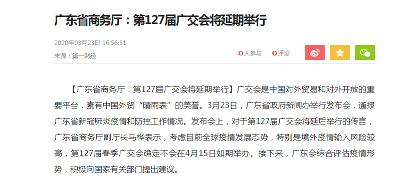 根據(jù)廣交會設計搭建公司領藝展覽了解到,3月23日,廣東省政府新聞辦舉行發(fā)布會,發(fā)布會上,對于第127屆廣交會將延后舉行的傳言,省商務廳副廳長馬樺表示,考慮目前全球疫情發(fā)展態(tài)勢,特別是境外疫情輸入風險較高,第127屆春季廣交會確定不會在4月15日如期舉辦。接下來,廣東會綜合評估疫情形勢,積極向國家有關部門提出建議如需廣交會設計請聯(lián)系領藝展覽,希望我們能在廣交會會搭建上為您添磚加瓦,祝各位朋友收獲多多,滿載而歸!