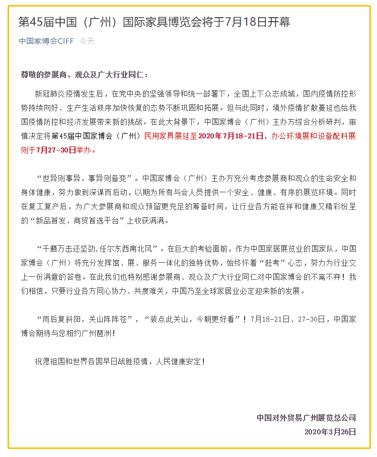 根據家具展設計搭建公司領藝展覽了解到,第45屆中國家博會(廣州)民用家具展延至2020年7月18-21日,辦公環(huán)境展和設備配料展則于7月27-30日舉辦。如需家具展設計請聯系領藝展覽,希望我們能在家具展搭建上為您添磚加瓦,祝各位朋友收獲多多,滿載而歸!