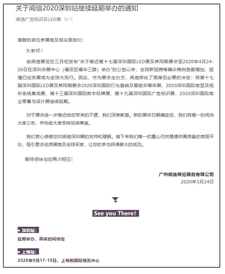 據(jù)LED展設(shè)計(jì)搭建公司領(lǐng)藝展覽了解到,自聞信展覽在三月初發(fā)布“關(guān)于推遲第十七屆深圳國際LED展及其同期展會(huì)至2020年4月24-26日在深圳會(huì)展中心(福田區(qū)福華三路)舉辦”的公告以來,全球新冠病毒確診病例急劇增加,疫情已經(jīng)發(fā)展成為全球大流行。因此,作為展會(huì)主辦方,聞信做出了艱難但必要的決定:將第十七屆深圳國際LED展及其同期展會(huì)2020深圳國際燈光音響及智能多媒體展、2020深圳國際商顯及視聽系統(tǒng)集成展、第十三屆深圳國際數(shù)字標(biāo)牌展、第十九屆深圳國際廣告標(biāo)識(shí)展、2020深圳國際商業(yè)零售與設(shè)計(jì)展繼續(xù)延期。如需LED展設(shè)計(jì)請(qǐng)聯(lián)系領(lǐng)藝展覽,希望我們能在LED展搭建上為您添磚加瓦,祝各位朋友收獲多多,滿載而歸!
