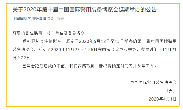 根據(jù)警博會(huì)設(shè)計(jì)搭建公司領(lǐng)藝展覽了解到,受新冠肺炎疫情影響,原定于2020年5月12日至15日舉辦的第十屆中國國際警用裝備博覽會(huì),延期至2020年11月23日至26日在國家會(huì)議中心舉辦,布展時(shí)間為11月21日至22日。如需警博會(huì)設(shè)計(jì)請(qǐng)聯(lián)系領(lǐng)藝展覽,希望我們能在警博會(huì)搭建上為您添磚加瓦,祝各位朋友收獲多多,滿載而歸!