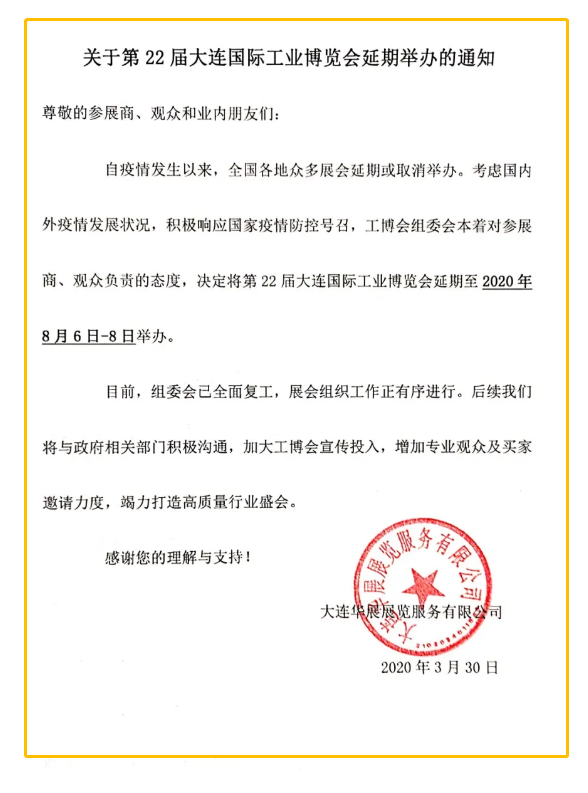 根據(jù)工博會(huì)設(shè)計(jì)搭建公司領(lǐng)藝展覽了解到,受疫情影響,第22屆大連國(guó)際工業(yè)博覽會(huì)延期舉辦,時(shí)間確定為2020年8月6日 —8日。如需工博會(huì)設(shè)計(jì)請(qǐng)聯(lián)系領(lǐng)藝展覽,希望我們能在工博會(huì)搭建上為您添磚加瓦,祝各位朋友收獲多多,滿載而歸!