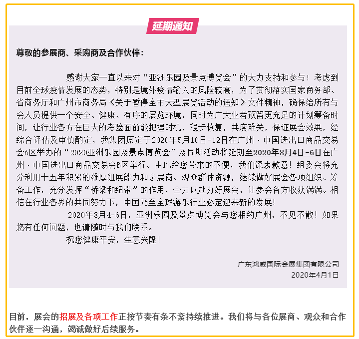 根據(jù)樂園展設(shè)計(jì)搭建公司領(lǐng)藝展覽了解到,受新冠肺炎疫情影響,原定于2020年5月10日-12日在廣州·中國進(jìn)出口商品交易會(huì)A區(qū)舉辦的“2020亞洲樂園及景點(diǎn)博覽會(huì)”及同期活動(dòng)將延期至2020年8月4日-6日在廣州·中國進(jìn)出口商品交易會(huì)B區(qū)舉行。如需樂園展設(shè)計(jì)請聯(lián)系領(lǐng)藝展覽,希望我們能在樂園展搭建上為您添磚加瓦,祝各位朋友收獲多多,滿載而歸!