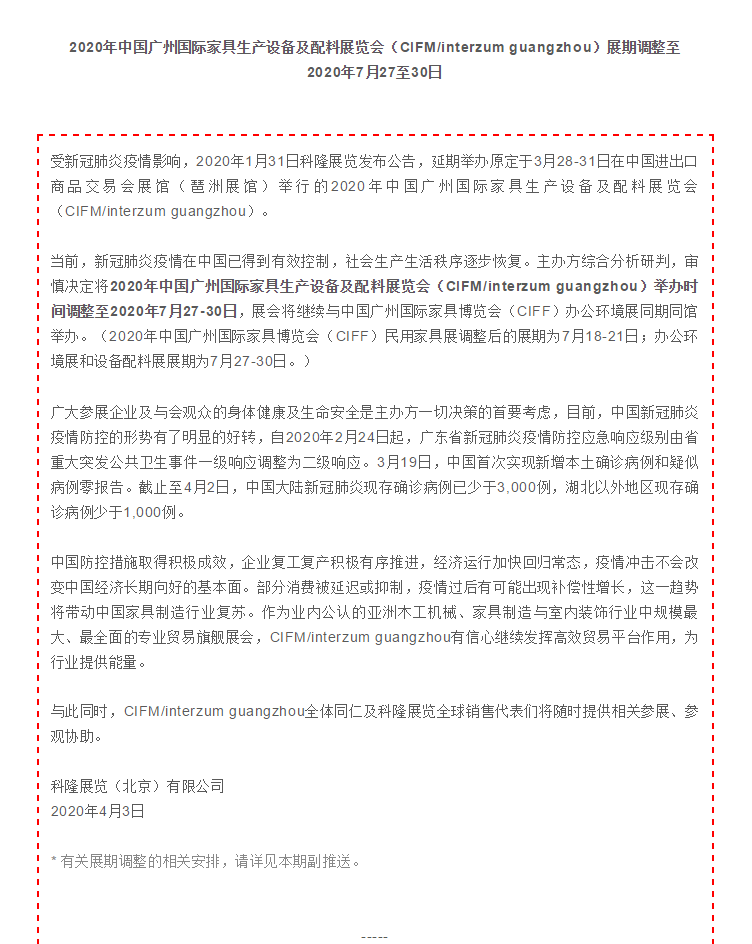 根據(jù)家具展設計搭建公司領(lǐng)藝展覽了解到,2020年中國廣州國際家具生產(chǎn)設備及配料展覽會(CIFM/interzum guangzhou)舉辦時間調(diào)整至2020年7月27-30日,展會將繼續(xù)與中國廣州國際家具博覽會(CIFF)辦公環(huán)境展同期同館舉辦。(2020年中國廣州國際家具博覽會(CIFF)民用家具展調(diào)整后的展期為7月18-21日;辦公環(huán)境展和設備配料展展期為7月27-30日。)如需家具展設計請聯(lián)系領(lǐng)藝展覽,希望我們能在家具展搭建上為您添磚加瓦,祝各位朋友收獲多多,滿載而歸!