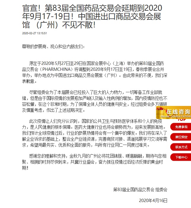 廣州藥交會設(shè)計搭建公司領(lǐng)藝展覽了解到,原定于2020年5月27日至29日在國家會展中心(上海)舉辦的第83屆全國藥品交易會(PHARMCHINA)將調(diào)整到2020年9月17日至19日,春秋季展會合并舉辦,舉辦地點(diǎn)為中國進(jìn)出口商品交易會展館(廣州)。如需廣州藥交會設(shè)計請聯(lián)系領(lǐng)藝展覽,希望我們能在廣州藥交會搭建上為您添磚加瓦,祝各位朋友收獲多多,滿載而歸!