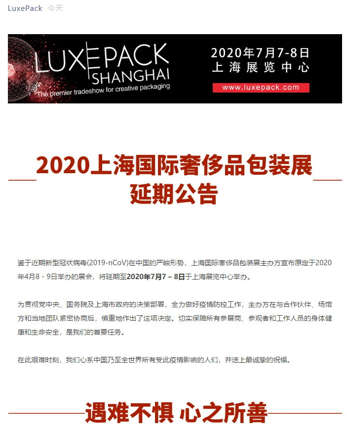 根據(jù)上海國際奢侈品包裝展設計搭建公司領藝展覽解到,鑒于近期新型冠狀病毒(2019-nCoV)在中國的嚴峻形勢,上海國際奢侈品包裝展主辦方宣布原定于2020年4月8 - 9日舉辦的展會,將延期至2020年7月7 – 8日于上海展覽中心舉辦。為貫徹黨中央、國務院及上海市政府的決策部署,全力做好疫情防控工作,主辦方在與合作伙伴、場館方和當?shù)貓F隊緊密協(xié)商后,慎重地作出了這項決定。如需上海國際奢侈品包裝展設計請聯(lián)系領藝展覽,希望我們能在上海國際奢侈品包裝展搭建上為您添磚加瓦,祝各位朋友收獲多多,滿載而歸!