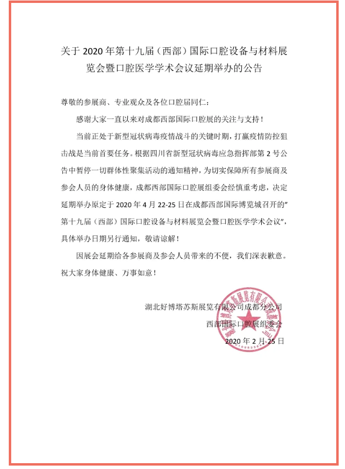 根據(jù)成都西部國際口腔展設計搭建公司領藝展覽了解到,當前正處于新型冠狀病毒疫情戰(zhàn)斗的關鍵時期,打贏疫情防控狙擊戰(zhàn)是當前首要任務。根據(jù)四川省新型冠狀病毒應急指揮部第2號公告中暫停一切群體性聚集活動的通知精神,為保障所有參展商及參會人員的安全和健康,成都西部國際口腔展組委會經(jīng)慎重考慮,決定延期舉辦原定于2020年4月22-25日在成都西部國際博覽城召開的“第十九屆(西部)國際口腔設備與材料展覽會暨口腔醫(yī)學學術會議”,具體舉辦日期另行通知,敬請諒解!如需成都口腔展設計請聯(lián)系領藝展覽,希望我們能在口腔展搭建上為您添磚加瓦,祝各位朋友收獲多多,滿載而歸!