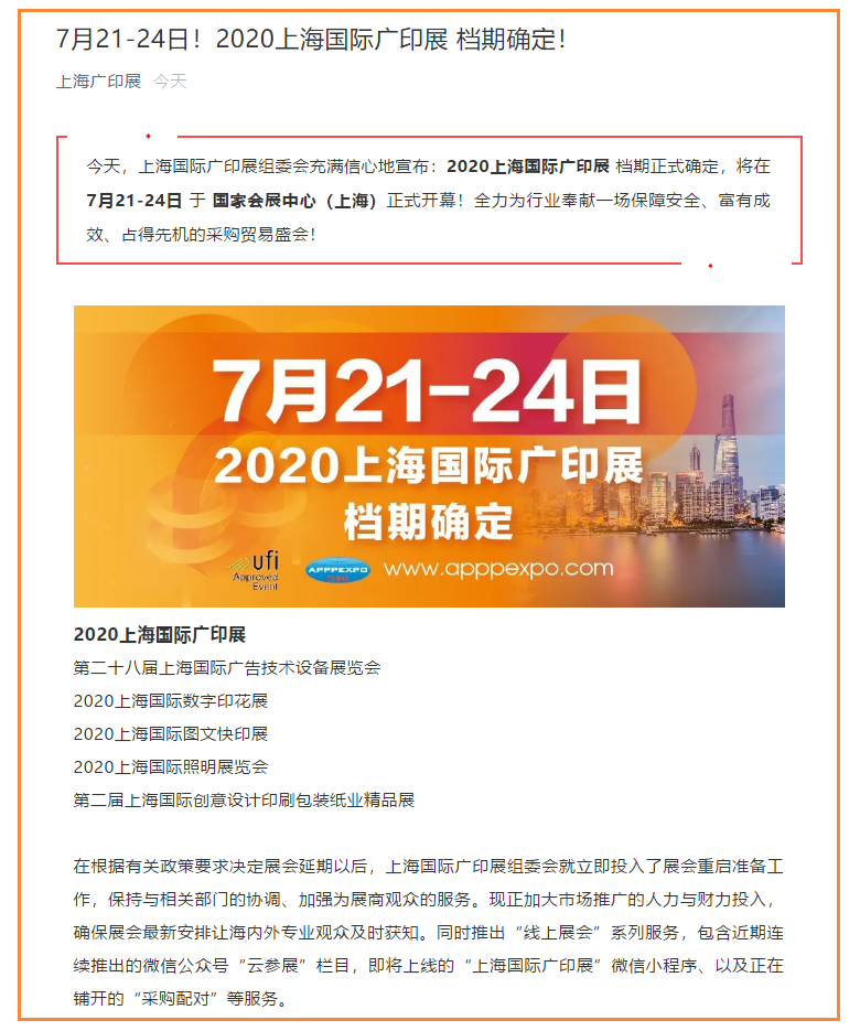 根據(jù)上海廣印展設(shè)計(jì)搭建公司領(lǐng)藝展覽了解到,今天,上海國(guó)際廣印展組委會(huì)充滿信心地宣布:2020上海國(guó)際廣印展 檔期正式確定,將在7月21-24日 于 國(guó)家會(huì)展中心(上海)正式開(kāi)幕!全力為行業(yè)奉獻(xiàn)一場(chǎng)保障安全、富有成效、占得先機(jī)的采購(gòu)貿(mào)易盛會(huì)!如需上海廣印展設(shè)計(jì)請(qǐng)聯(lián)系領(lǐng)藝展覽,希望我們能在上海廣印展搭建上為您添磚加瓦,祝各位朋友收獲多多,滿載而歸!