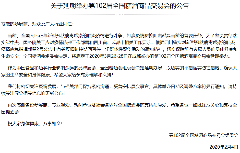 當(dāng)前,全國人民正與新型冠狀病毒感染的肺炎疫情進(jìn)行斗爭(zhēng),打贏疫情防控阻擊戰(zhàn)是當(dāng)前的首要任務(wù)。為了堅(jiān)決貫徹落實(shí)黨中央、國務(wù)院關(guān)于應(yīng)對(duì)疫情防控工作部署和四川省、成都市相關(guān)工作要求,根據(jù)四川省應(yīng)對(duì)新型冠狀病毒感染的肺炎疫情應(yīng)急指揮部第2號(hào)公告中有關(guān)疫情防控期間暫停一切群體性聚集活動(dòng)的通知精神,切實(shí)保障所有參展人員的身體健康和生命安全,全國糖酒會(huì)組委會(huì)決定,將原定于2020年3月26-28日在成都舉辦的第102屆全國糖酒商品交易會(huì)延期舉辦。如需成都糖酒展設(shè)計(jì)請(qǐng)聯(lián)系領(lǐng)藝展覽,希望我們能在成都糖酒展搭建上為您添磚加瓦,祝各位朋友收獲多多,滿載而歸!