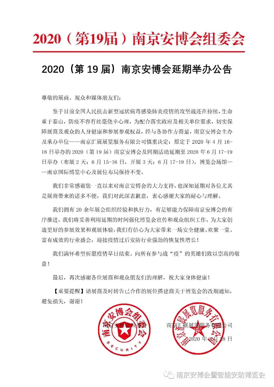 根據(jù)南京安博會(huì)設(shè)計(jì)搭建公司領(lǐng)藝展覽了解到,鑒于目前全國(guó)人民抗擊新型冠狀病毒感染肺炎疫情的攻堅(jiān)戰(zhàn)還在持續(xù),生命重于泰山,防疫不容有絲毫僥幸心理,為配合落實(shí)政府及相關(guān)單位要求,切實(shí)保障展商及觀眾的人身健康和參展參觀權(quán)益,經(jīng)與各協(xié)作方商量,南京安博會(huì)主辦及承辦單位——南京匯展展覽服務(wù)有限公司慎重決定:原定于2020年4月16-18日舉辦的2020(第19屆)南京安博會(huì)及同期活動(dòng)延期至2020年6月17-19日舉辦(布展2天:6月15-16日,開展3天:6月17-19日),博覽會(huì)場(chǎng)館——南京國(guó)際博覽中心及展位布局保持不變。如需南京安博會(huì)設(shè)計(jì)請(qǐng)聯(lián)系領(lǐng)藝展覽,希望我們能在南京安博會(huì)搭建上為您添磚加瓦,祝各位朋友收獲多多,滿載而歸!