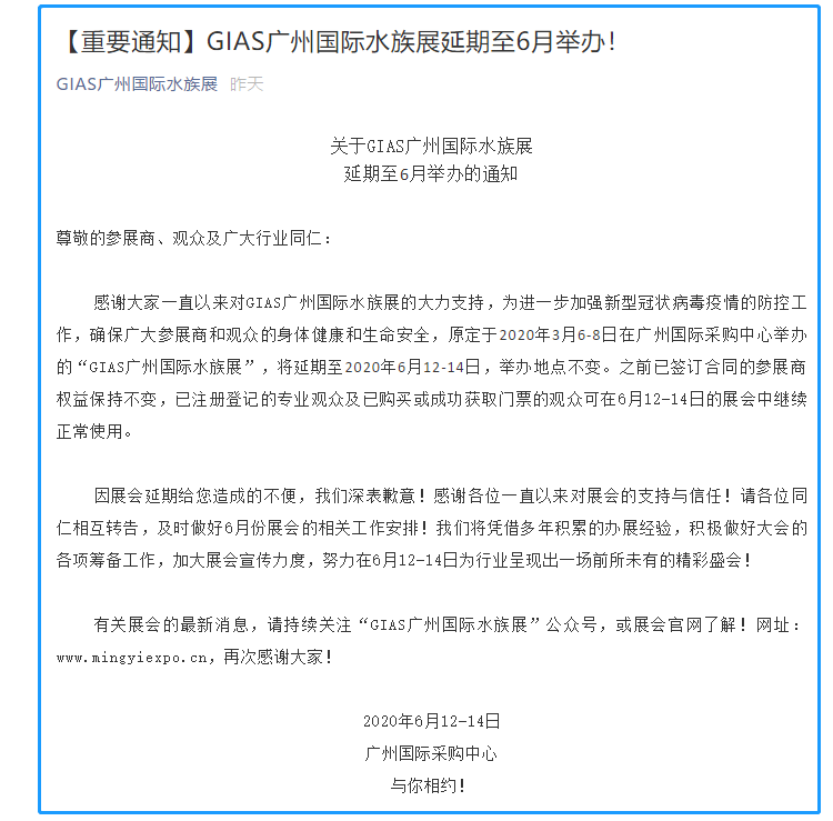 根據(jù)廣州水族展設(shè)計(jì)搭建公司領(lǐng)藝展覽了解到,為進(jìn)一步加強(qiáng)新型冠狀病毒疫情的防控工作,確保廣大參展商和觀眾的身體健康和生命安全,原定于2020年3月6-8日在廣州國(guó)際采購(gòu)中心舉辦的“GIAS廣州國(guó)際水族展”,將延期至2020年6月12-14日,舉辦地點(diǎn)不變。如需廣州水族展設(shè)計(jì)請(qǐng)聯(lián)系領(lǐng)藝展覽,希望我們能廣州水族展搭建上為您添磚加瓦,祝各位朋友收獲多多,滿載而歸!