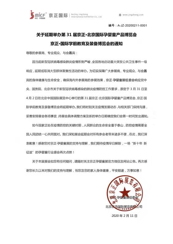 根據(jù)北京孕嬰童展設(shè)計(jì)搭建公司領(lǐng)藝展覽了解到,原定于2020年3月31日至4月2日在北京中國國際展覽中心舉辦的第31屆京正·北京國際孕嬰童產(chǎn)品博覽會(huì)將延期舉辦,具體展覽時(shí)間將視疫情另行通知。如需北京孕嬰童展展臺(tái)設(shè)計(jì)請(qǐng)聯(lián)系領(lǐng)藝展覽,希望我們能在北京孕嬰童展展臺(tái)搭建上為您添磚加瓦,祝各位朋友收獲多多,滿載而歸!