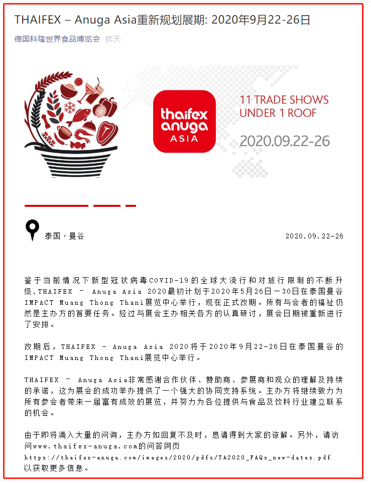 根據(jù)食品展設(shè)計(jì)搭建公司領(lǐng)藝展覽了解到,鑒于當(dāng)前情況下新型冠狀病毒COVID-19的全球大流行和對旅行限制的不斷升級,THAIFEX – Anuga Asia 2020最初計(jì)劃于2020年5月26日—30日在泰國曼谷IMPACT Muang Thong Thani展覽中心舉行,現(xiàn)在正式改期。所有與會者的福祉仍然是主辦方的首要任務(wù)。經(jīng)過與展會主辦相關(guān)各方的認(rèn)真研討,展會日期被重新進(jìn)行了安排。改期后,THAIFEX - Anuga Asia 2020將于2020年9月22-26日在泰國曼谷的IMPACT Muang Thong Thani展覽中心舉行。如需食品展設(shè)計(jì)請聯(lián)系領(lǐng)藝展覽,希望我們能在食品展搭建上為您添磚加瓦,祝各位朋友收獲多多,滿載而歸!